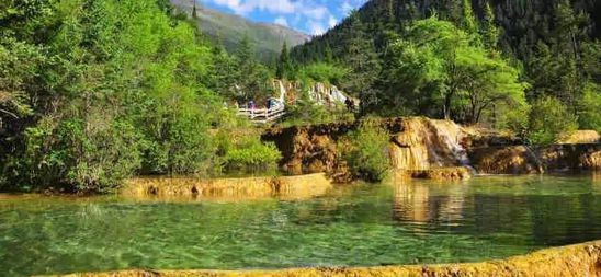 黃龍風(fēng)景區(qū)位于四川省阿壩藏族羌族自治州松潘縣境內(nèi),主景區(qū)黃龍溝位于岷山主峰雪寶頂下,主要因佛門名剎黃龍寺而得名。它是一條長約7公里,寬約300米的鈣化山峽,這里山勢如龍,又稱“藏龍山”。黃龍以彩池、雪山、峽谷、森林“四絕”著稱于世,是中國唯一的保護(hù)完好的高原濕地。這一地區(qū)還生存著許多瀕臨滅絕的動物,包括大熊貓和四川疣鼻金絲猴。