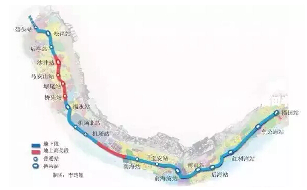 深圳地鐵11號(hào)線(xiàn)全長(zhǎng)51.936千米,于2012年底動(dòng)工,身兼機(jī)場(chǎng)快線(xiàn)和廣深城際軌道線(xiàn)路雙重任務(wù),從福田中心樞紐到車(chē)公廟,然后轉(zhuǎn)向?yàn)I海大道的濱海醫(yī)院,從世界之窗后方經(jīng)過(guò)在建的跨國(guó)集團(tuán)總部基地,到南山前海灣,然后直通深圳機(jī)場(chǎng),再到深莞邊界,這條線(xiàn)從市區(qū)到機(jī)場(chǎng)只需要30分鐘。
