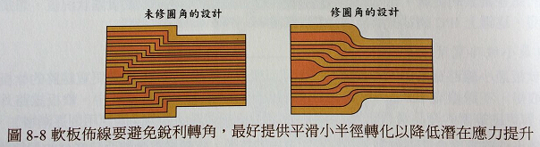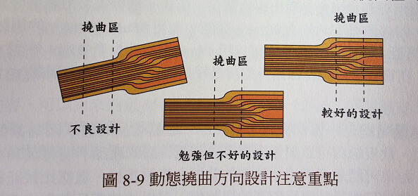 產(chǎn)品加入軟板設(shè)計,可以讓設(shè)計者一些線路分割,零件組裝的部分可以用支撐方式強化達成類似硬板的結(jié)構(gòu),這些設(shè)計的可能性都讓軟板繞線整合技術(shù)應(yīng)用范圍更加寬廣。但是恰當(dāng)?shù)膿锨较騾s是軟板設(shè)計的重點,圖8-9所示為軟板設(shè)計采用撓曲性的基本考慮方式。