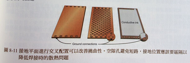接地區(qū)域,在電性允許狀況下應(yīng)該要進行交叉打線的設(shè)計,這種做法可以同時幫助降低重量與改善軟板撓曲性。接地平面的開口尺寸可能是關(guān)鍵,必須搭配產(chǎn)品遮蔽性或特性阻抗控制來決定。如果開口過大,遮蔽效應(yīng)可能會受到破壞,這方面會與頻率相關(guān)。同時在接地銅面連接元件部分,應(yīng)該要降低熱釋放的狀況,并確認(rèn)可以形成良好的焊錫結(jié)合。這可以利用在襯墊四周蝕刻出空區(qū)來達成,不過仍然要保持電性連接,圖8-11所示,為這個接地連接技術(shù)的描述。