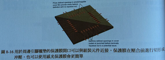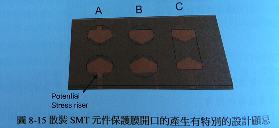 使用鉆孔或開槽、切形在壓合前將保護(hù)膜加工,是軟板制造焊錫襯墊近接區(qū)域的普遍方法。不過(guò)如果直接布線進(jìn)入襯墊,保護(hù)膜對(duì)位不良可能導(dǎo)至應(yīng)力提升。圖8-15(A)中,潛在的應(yīng)力提升狀況還是重覆出現(xiàn)。邊緣或轉(zhuǎn)角進(jìn)入襯墊有利于對(duì)位偏移的容忍度(圖8-15(B))。雷射切割或機(jī)械沖壓、切形加工的保護(hù)膜開口,可以做成矩形(圖8-15(C))。