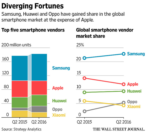 蘋果、三星等巨頭近日均公布了2016年第三季度財報,雖然蘋果的硬件多出現(xiàn)下滑趨勢、三星手機則稍微增長,但從全局來看,兩家廠商的盈利都過于依賴旗艦級智能手機,并且?guī)缀鯖]有增長,通過《華爾街日報》的分析圖可以清楚地看到這一點。不過,PCB廠小編覺得,這并不意味著蘋果和三星很快就會衰敗,事實上它們都擁有一些長遠性的戰(zhàn)略投資和部署,這些業(yè)務(wù)也許會在未來成為擁有巨大盈利能力的項目。下面,一起來了解一下。
