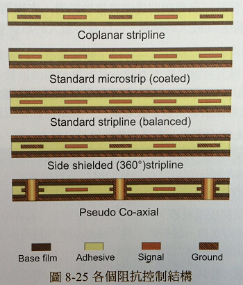 阻抗控制電子訊號(hào)傳輸電纜的應(yīng)用,是FPC最適合發(fā)揮能力的應(yīng)用之一。因?yàn)楦咚?、高性能的電子產(chǎn)品快速增加,使用阻抗控制互連技術(shù)的產(chǎn)品可以期待會(huì)成長(zhǎng)。后續(xù)內(nèi)容是一些可以取得的FPC結(jié)構(gòu)類型,圖8-25所示為各個(gè)類型的范例。