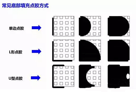再接下來則是底部填充點膠,而這其中又分為單邊點膠、L形點膠、U型點膠三種方式。其中的工藝要求是芯片四邊均進行膠水填充、側面單邊溢膠距離<0.4mm、芯片高度0.85mm,上表面無膠水污染等要求。