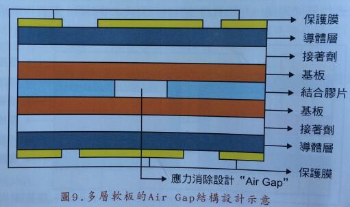 FPC軟板走向多層化,與折疊式手機的大量設計采用有絕對關系,此外可攜式電子產(chǎn)品強調(diào)重量輕、體積小與功能多,使線路布線配合構(gòu)裝往多層化發(fā)展,F(xiàn)PC軟板多層化原本對軟板而言是會失去可撓曲的特性,但透過在動態(tài)區(qū)域作應力消除設計可維持FPC軟板動態(tài)應用之需求并符合高密度的多層線路設計,一般稱此設計為”air gap”,側(cè)視結(jié)構(gòu)圖可參考下圖9。