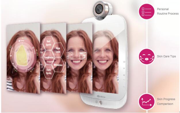 當(dāng)然,HiMirror的攝像頭不簡單,內(nèi)置的傳感器可以對面部皮膚進(jìn)行分析,包括皺紋、細(xì)紋、黑眼圈、膚色、黑斑、紅點(diǎn)、毛孔等等,以圖形化的形式展示你的皮膚問題,并給出一些改善建議。