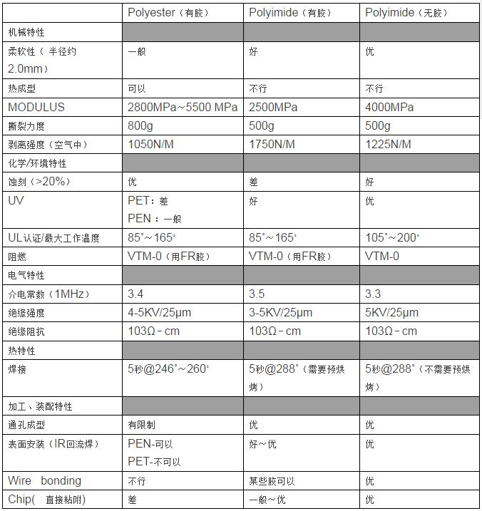 根據(jù)需求的不同,柔性電路板使用的板材也不一樣。可以從應(yīng)用的場合及成本等方面加以綜合考慮。常用的有Polyimide(聚酰亞胺,分有膠和無膠)和Polyester(聚酯)。這幾種材料的特性比較如下表所示: