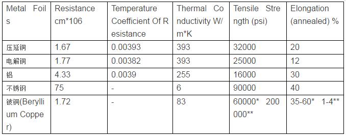 除了銅箔以外,柔性板的其它導(dǎo)體材料還有銅鎳合金(比如Constantan)和導(dǎo)電涂料。導(dǎo)電涂料是導(dǎo)電材料(如銀,碳等)混合聚合物粘接劑(如樹脂)構(gòu)成的漿狀物。導(dǎo)電涂料印刷在介質(zhì)表面,然后再覆蓋起來。例如銀漿,如果覆蓋絕緣好的話,它的導(dǎo)電性能也是非常不錯(cuò)的。導(dǎo)電涂料與銅箔相比電氣性能稍遜,阻抗系數(shù)也比較高,在某些應(yīng)用柔性場合不適合用它做導(dǎo)體。下表列出各種金屬薄膜的特性比較。