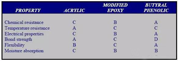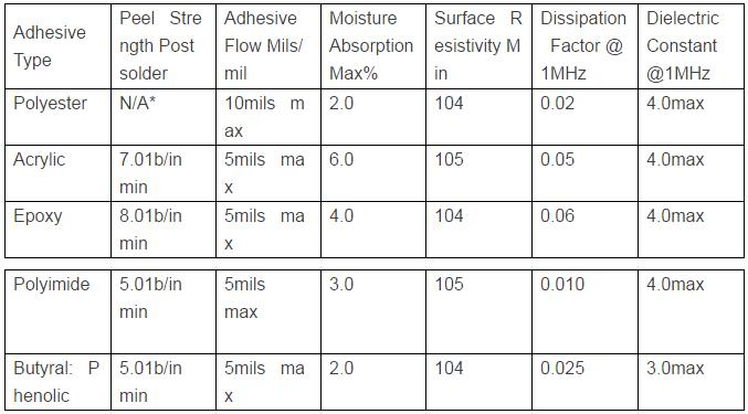 在柔性板設(shè)計(jì)時(shí),選擇合適的膠來粘接導(dǎo)體和介質(zhì)也是非常重要的。它必須保證FPC 在加工時(shí)不脫膠或不過多地溢膠。柔性板常用的膠有丙烯酸(acrylic),改良環(huán)氧樹脂(modified epoxy), 酚丁縮醛(Phenolic Butyrals),增強(qiáng)膠,壓敏膠等等。下表列舉了幾種膠的特性。