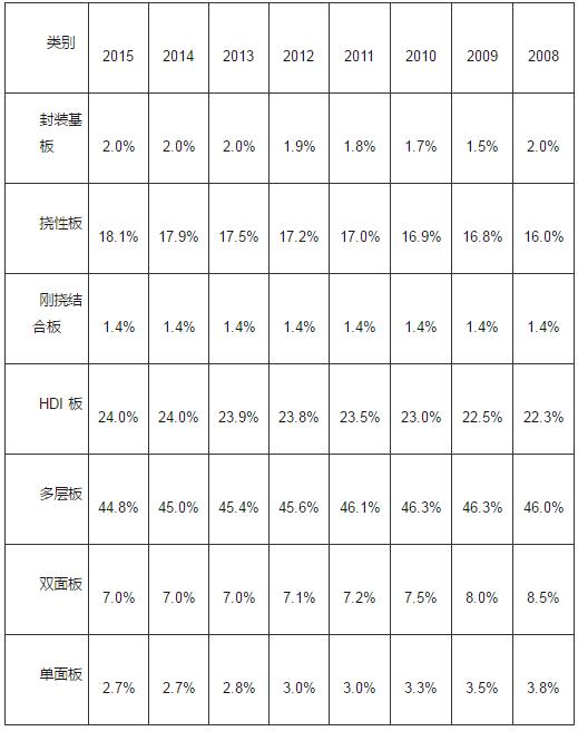 2008-2015年中國大陸地區(qū)PCB產(chǎn)品結(jié)構(gòu)