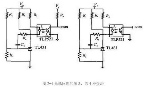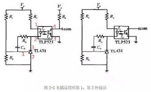 高于反相端電位的形式,利用運放的一種特性—當運放輸出電流過大(超過運放電流輸出能力)時,運放的輸出電壓值將下降,輸出電流越大,輸出電壓下降越多。因此,采用這種接法的電路,一定要把PWM(脈沖寬度調(diào)制)芯片的誤差放大器的兩個輸入引腳接到固定電位上,且必須是同向端電位高于反向端電位,使誤差放大器初始輸出電壓為高。圖2-3所示接法的工作原理是:當輸出電壓升高時,原邊電流If增大,輸出電流Ic增大,由于Ic已經(jīng)超過了電壓誤差放大器的電流輸出能力,com腳電壓下降,占空比減小,輸出電壓減?。环粗?,當輸出電壓下降時,調(diào)節(jié)過程類似。