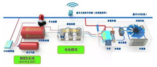 動(dòng)力電池安全智能系統(tǒng)分為三部分:a)電池系統(tǒng);b)熱管理系統(tǒng);c)自動(dòng)滅火系統(tǒng)。
