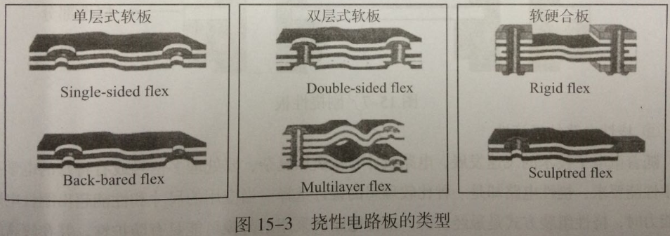 柔性電路板的四大類,有單面、雙面、多層柔性電路板和軟硬結(jié)合電路板,各類柔性電路板見圖15-3所示。