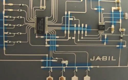 Jabil展示柔性的塑料電路板,使用印刷在柔性基板上的導線和電路,以及安裝在其上的超薄型芯片。