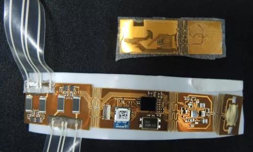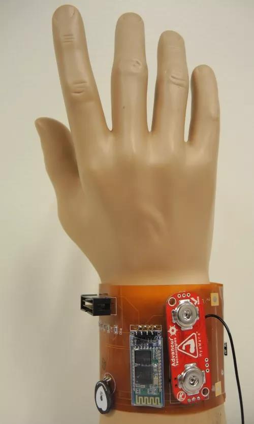 Auburn展示一款安全腕帶,可用于監(jiān)測在危險情況下工作的人員。目前的設計采用聚酰亞胺基板,但該團隊也正研究如何在其它塑料基板上使用增層印刷以利電路布局。