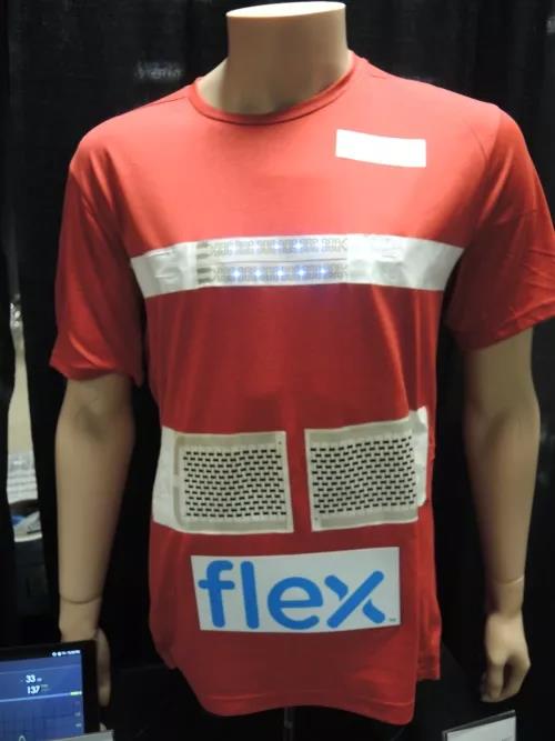 合約制造商Flex展示一款帶ECG傳感器的加熱運動衫,其中編織進柔性照明和加熱組件。這種柔性加熱組件也已經(jīng)開始用于汽車后視鏡和滑雪護目鏡了。