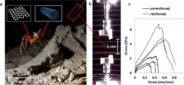 科學(xué)家使用碳納米管和石墨烯,可以使普通的蜘蛛絲變得更強韌。意大利特倫托大學(xué)的Nicola Pugno教授帶領(lǐng)的一個研究團隊,成功地使蜘蛛吐出的蛛絲強度提升了3倍,韌性提升了10倍。