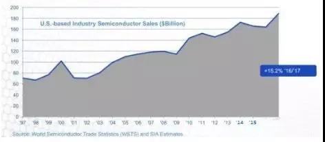 據(jù)統(tǒng)計(jì),總部位于美國的半導(dǎo)體公司的銷售額在1997年的時(shí)候僅為709億美元,到了2017年,這個(gè)數(shù)字已經(jīng)飆升到18890億美元,年平均符合增長(zhǎng)率達(dá)到5.02%。我們從總部位于美國的半導(dǎo)體公司的銷售額變化可以看到半導(dǎo)體產(chǎn)業(yè)的周期性波動(dòng)特征。