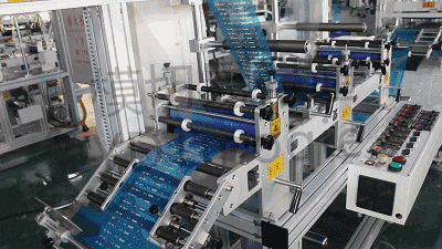 8、進入三工位貼合機排廢整版材料外框后收卷成型。