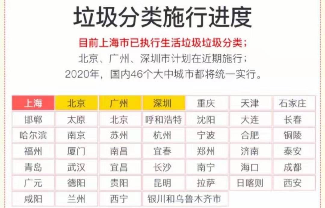 到 2020年底,先行先試的46個重點(diǎn)城市基本建成垃圾分類處理系統(tǒng)。2025年前,全國地級及以上城市要基本建成垃圾分類處理系統(tǒng)。來看看有沒有你的城市。