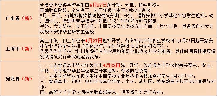 9日,廣東、上海和河北3個地區(qū)宣布了最新的開學(xué)時間。據(jù)教育部相關(guān)消息,截至4月10日,已有29個省區(qū)市公布了開學(xué)時間。全國只有北京、湖北、這2個地區(qū)還未給出開學(xué)通知。