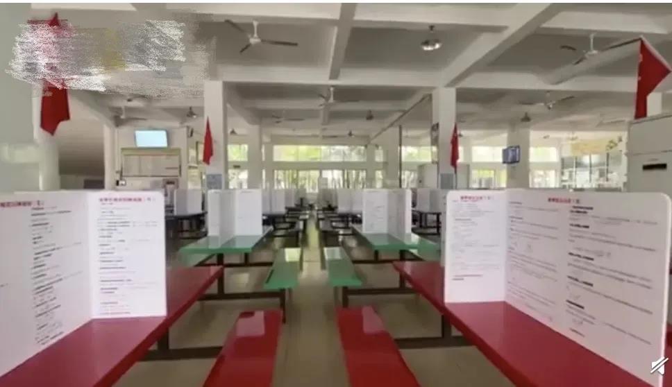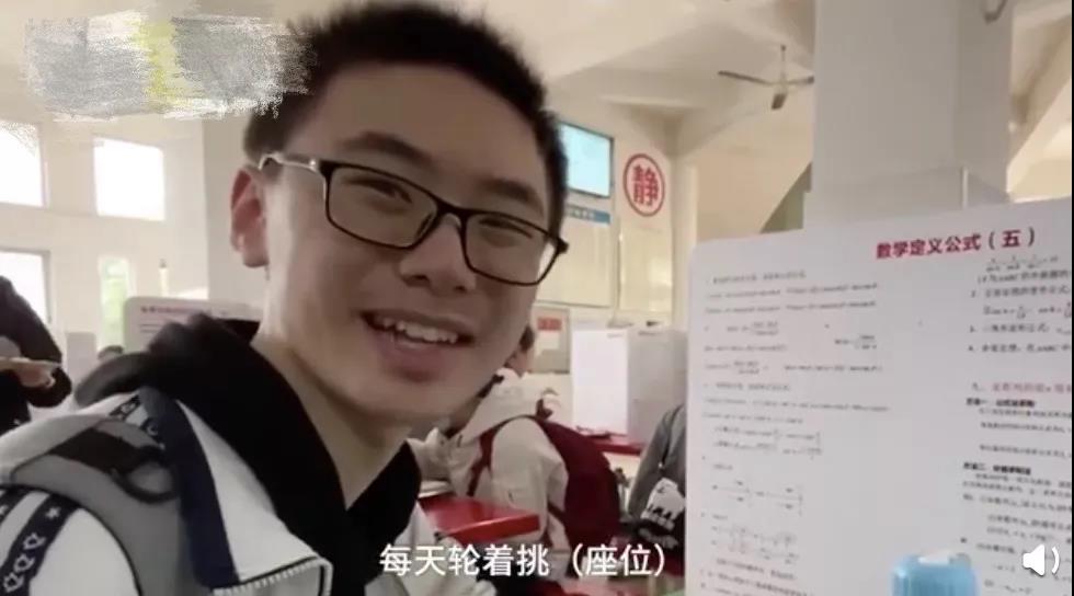 請(qǐng)注意這可不是普通的隔板,上面滿屏都是高考知識(shí)點(diǎn)!該校老師介紹,這里每個(gè)學(xué)科都有,語(yǔ)數(shù)外較多,物化生政史地則按比例平均分配。有的同學(xué)表示這種隔板非常好,每天吃飯都輪著挑座位。