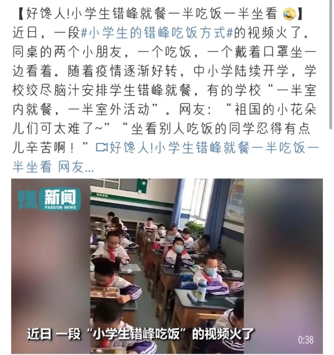 當(dāng)天,還有這么一所學(xué)校也火了。視頻顯示,這家小學(xué)推行錯(cuò)峰吃飯,一半孩子先在吃飯,而另一半孩子則佩戴好口罩,雙手放在桌子上坐好。小朋友,你是否有很多問(wèn)號(hào)??為什么別人都在吃飯,我卻只能看著……