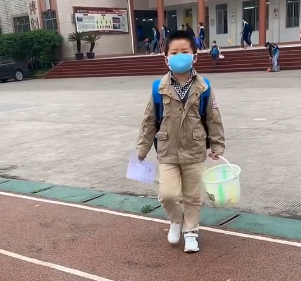 4月13日,四川武勝沿口小學(xué)開(kāi)始復(fù)學(xué)復(fù)課,在這天早上,一位背著書(shū)包的小男孩拎著桶來(lái)到學(xué)校報(bào)到。