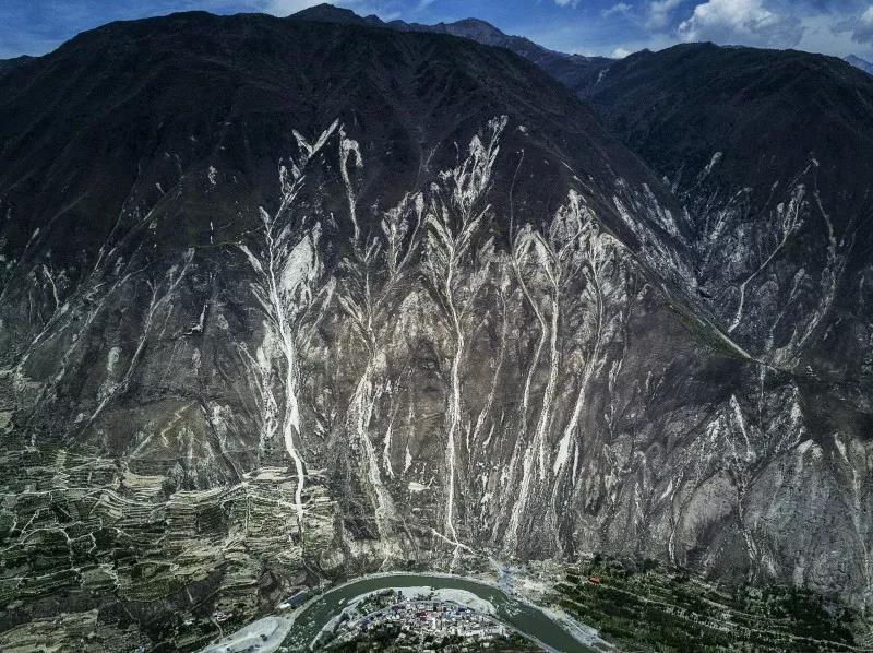 △ 2008年5月12日 汶川縣雁門鎮(zhèn)地動山搖,山體驟然滑落,留下道道溝壑。