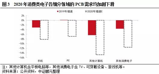 預(yù)計(jì)2020年在PCB下游應(yīng)用占比近6成的手機(jī)、PC等消費(fèi)類電子領(lǐng)域的需求或萎縮約10%。2019年全球手機(jī)出貨量降幅收縮,PC及平板電腦出貨量略有回溫;同期中國大陸在上述領(lǐng)域的PCB產(chǎn)值占全球的比重超過70%,海外需求下滑將對國內(nèi)PCB市場擾動(dòng)較大。