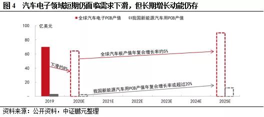 2020年全球汽車電子領(lǐng)域的PCB需求或下滑約8%,未來隨著新能源汽車滲透率及汽車電子化率的提升,全球車用PCB市場規(guī)模有望擴(kuò)大至90億美元,年復(fù)合增長約5%。2019年中國汽車產(chǎn)量同比下降8%,其中新能源汽車產(chǎn)量連續(xù)三年高速增長后首年下降0.6%。