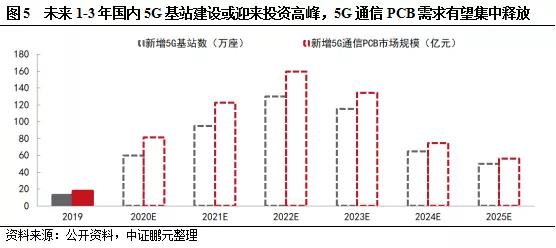 5G基站建設(shè)始于2019年下半年,預(yù)計(jì)2020年新增60萬座,同比增長3.6倍,考慮5G基站對高頻高速信號傳輸?shù)囊?,單?G基站帶動(dòng)的PCB價(jià)值量約為4G的2.5倍;參照4G投資進(jìn)度,預(yù)計(jì)整個(gè)5G基站建設(shè)周期將為通信PCB帶來約640億元的市場增量,并有望于2021-2023年迎來投資高峰。