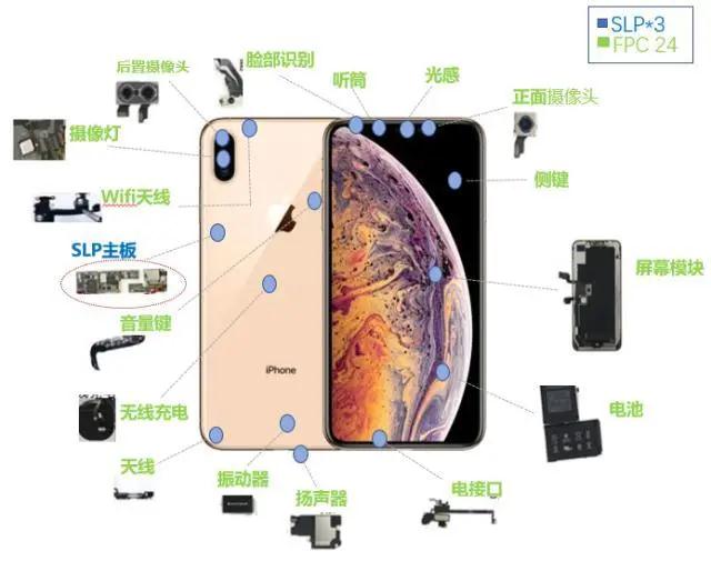 其他品牌的智能手機(jī)FPC用量普遍在10-15塊,單機(jī)價(jià)值也相對(duì)便宜。iPhone XS MAX電路板使用高達(dá)27片,包括3片SLP主板及24片軟板,預(yù)測(cè)價(jià)值量超過70美元。