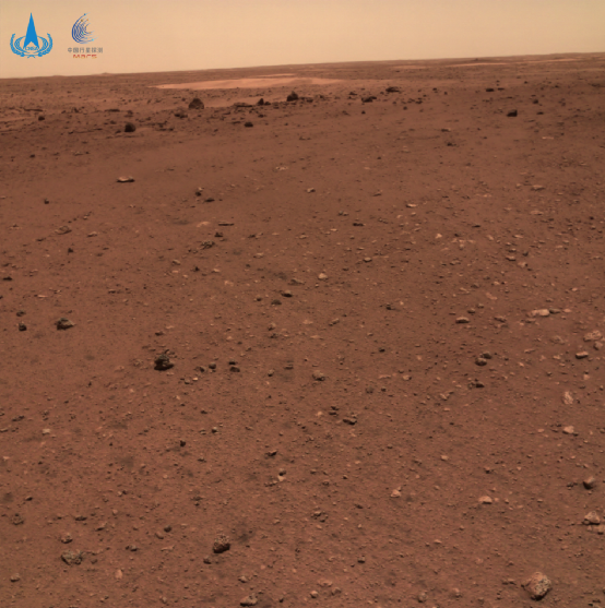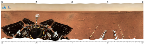 當(dāng)祝融號(hào)尚未駛離著陸平臺(tái)時(shí),先由桅桿上的導(dǎo)航地形相機(jī)進(jìn)行360°環(huán)拍,經(jīng)過校正和鑲嵌拼接而成了這張全景圖。圖像顯示,著陸點(diǎn)附近地勢(shì)平坦,遠(yuǎn)處可見火星地平線,石塊豐度和尺寸與預(yù)期一致,表明著陸點(diǎn)自主選擇和懸停避障實(shí)施效果良好。