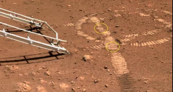 除了祝融號(hào)火星車上的五星紅旗清晰可見之外,著陸平臺(tái)上的國旗也是引人注目,國旗旁邊是北京冬奧會(huì)和冬殘奧會(huì)吉祥物的“冰墩墩”和“雪容融”。而祝融號(hào)桅桿頭部上的紅色印記則是“火”字,出自出自南宋官印“桓術(shù)火倉之印”。仔細(xì)放大看的話,也能看到祝融號(hào)車輪上留下“中”字的印記。