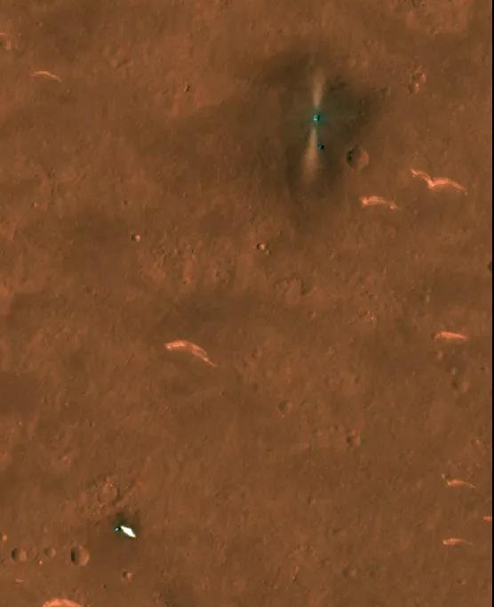 除了祝融號(hào)自己拍攝的圖片外,近期美國的MRO火星軌道器搭載的HiRise相機(jī)也捕捉到了祝融及著陸平臺(tái)。