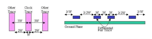 為了減少線間串?dāng)_,應(yīng)保證線間距足夠大,當(dāng)線中心間距不少于3倍線寬時,則可保持70%的電場不互相干擾,稱為3W規(guī)則。如要達(dá)到98%的電場不互相干擾,可使用10W的間距。