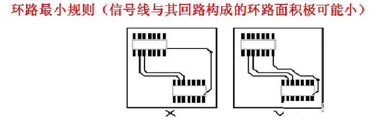 環(huán)路最小規(guī)則,即信號線與其回路構(gòu)成的環(huán)面積要盡可能小,環(huán)面積越小,對外的輻射越少,接收外界的干擾也越小。