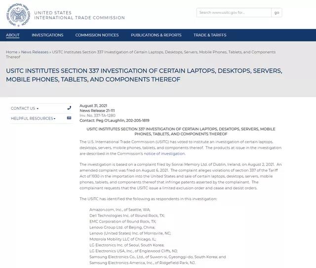 據(jù)柔性電路板小編了解,此次調(diào)查主要由愛(ài)爾蘭 Sonrai Memory 發(fā)起申請(qǐng),聲稱這些公司正在制造或銷售在海外制造的筆記本電腦、臺(tái)式機(jī)和手機(jī),這些筆記本電腦、臺(tái)式機(jī)和手機(jī)侵犯了其三項(xiàng)專利。