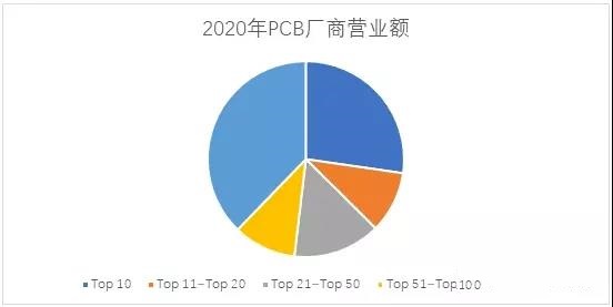 在PCB廠商方面,基于2020年各大廠商的營(yíng)收情況,全球Top100的PCB廠商2020年總營(yíng)收約2800億人民幣,占據(jù)全球PCB總產(chǎn)值高達(dá)50%以上(2020年全球PCB總產(chǎn)值按4500億人民幣預(yù)估),其中Top10的廠商2020年總營(yíng)收約1100億人民幣,約占據(jù)Top100廠商總營(yíng)業(yè)額40%,約占全球總產(chǎn)值的25%;Top10至Top20的廠商2020年總營(yíng)收約400億人民幣,約占全球總產(chǎn)值的9%,Top20至Top50的廠商2020年總營(yíng)收約500億人民幣,約占全球總產(chǎn)值的11%。