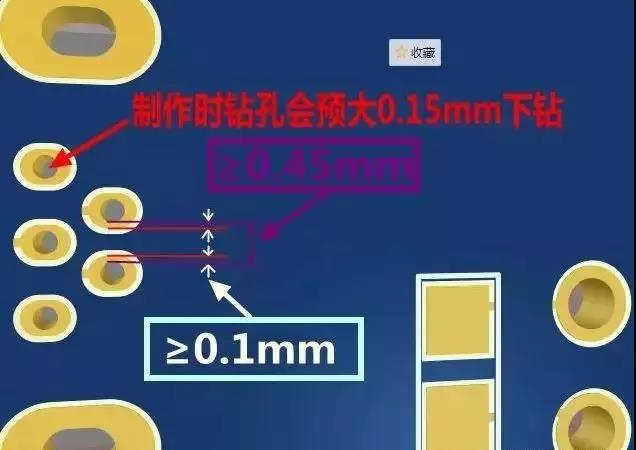 插件孔與插件之間的間距:孔邊緣間距≥17mil(0.45mm),極限為12mil。插件孔汽車FPC制作時鉆孔會預(yù)大0.15mm下鉆,鉆完后再沉上銅,最終保證沉銅后的孔徑與汽車FPC設(shè)計(jì)時的成品孔一樣大。(孔邊緣間距0.45=0.15孔補(bǔ)償 + 0.1孔環(huán)+ 0.1 孔環(huán) + 0.1 安全間距 ,單位mm)