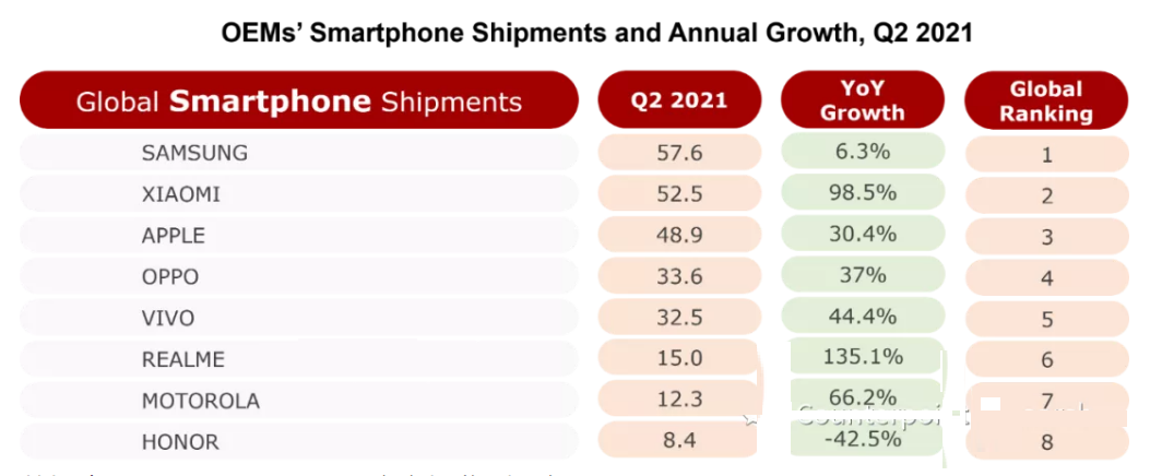 新興市場(chǎng)5G智能手機(jī)出貨量的快速增長(zhǎng)可以歸功于iPhone 12,這是蘋(píng)果首款支持5G的智能手機(jī)產(chǎn)品。于此同時(shí),其他OEM廠商,如OPPO、vivo、小米和realme在入門(mén)級(jí)的細(xì)分市場(chǎng)中加大了5G產(chǎn)品的部署。在新興市場(chǎng),特別是東南亞和中東地區(qū),5G基礎(chǔ)設(shè)施建設(shè)方面正在迎頭趕上,因此在未來(lái)幾個(gè)季度,這些國(guó)家對(duì)入門(mén)級(jí)5G手機(jī)的需求將會(huì)不斷增加。
