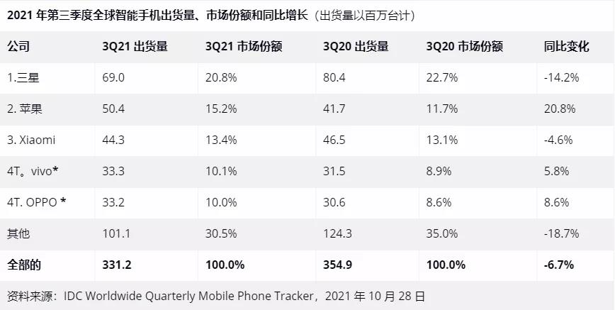 先來看整體情況,由于受到缺芯或其它元器件的影響,第三季度手機總出貨量3.312億部,同比下滑6.7%,比之前預期的還要低。
