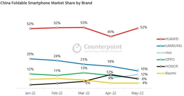據(jù)手機(jī)無線充軟板小編了解,從廠商排名上看,1~5月,華為占據(jù)中國(guó)折疊屏手機(jī)市場(chǎng)銷量的50%;其次是三星,占比為20%;OPPO和小米分別位居第三和第四位。自2022年4月,vivo進(jìn)入折疊屏手機(jī)市場(chǎng),僅基于4月和5月的銷售情況,它以10.3%的市場(chǎng)份額顯示出良好的開端。