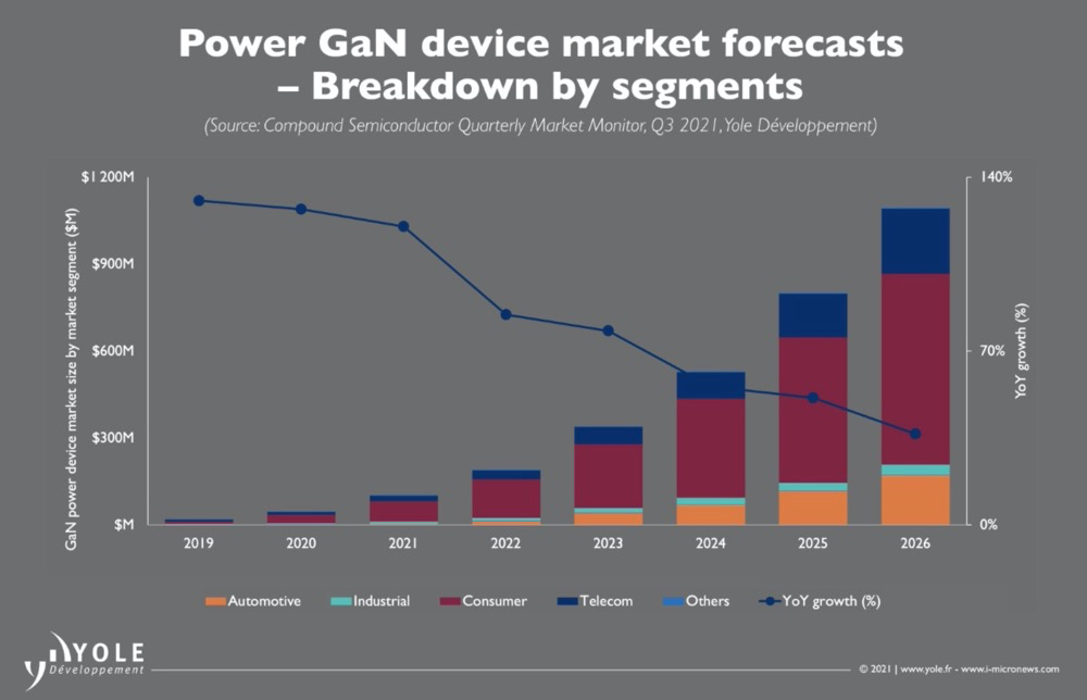 預(yù)計(jì)在2021年至2027年間,全球GaN功率器件市場(chǎng)的復(fù)合年增長(zhǎng)率將達(dá)到30%,到2027年市場(chǎng)規(guī)模有望超過(guò)10億美元,據(jù)行業(yè)預(yù)測(cè),從2021年到2027年,全球GaN功率器件市場(chǎng)的復(fù)合年增長(zhǎng)率(CAGR)預(yù)計(jì)將達(dá)到30%,并預(yù)計(jì)到2027年,其市場(chǎng)規(guī)模將超過(guò)10億美元。這種增長(zhǎng)的推動(dòng)力主要源自電力電子設(shè)備的小型化和高效率化需求。由于GaN的物理特性,它能夠?yàn)殡娏﹄娮釉O(shè)備提供小型化和高效率化的解決方案。例如,GaN的低開(kāi)關(guān)損耗和高工作頻率能夠顯著提高電源的運(yùn)行效率和功率密度,這在很大程度上推動(dòng)了其在電源市場(chǎng)的應(yīng)用。