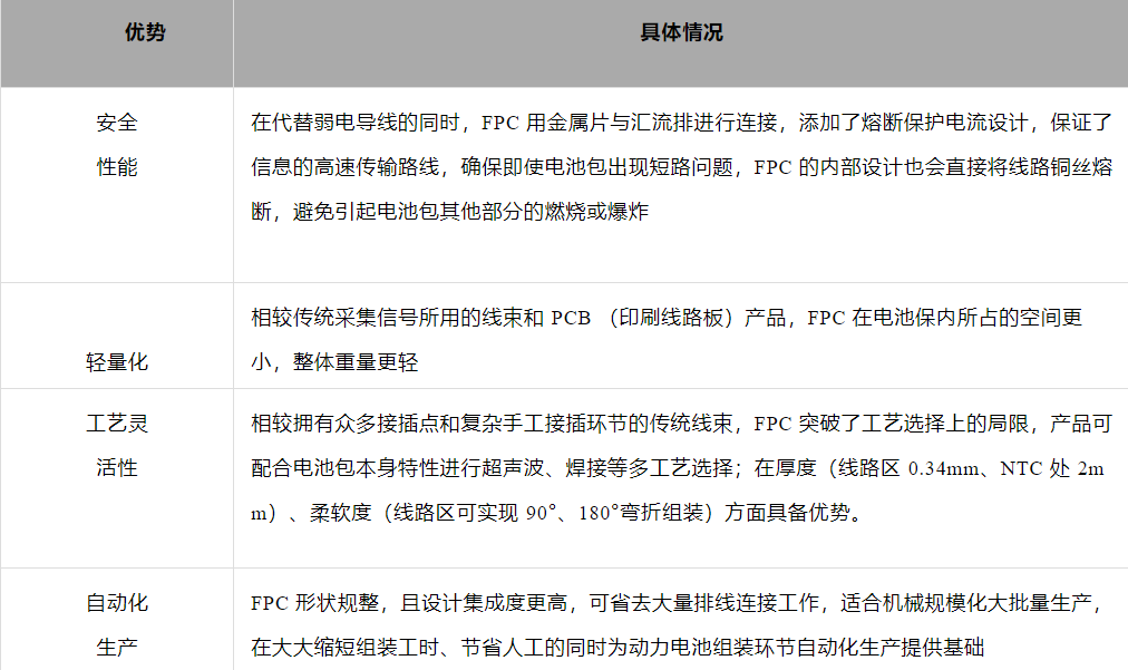 相較銅線線束,F(xiàn)PC 由于其高度集成、超薄厚度、超柔軟度等特點(diǎn),在安全性、輕量化、布局規(guī)整等方面具備突出優(yōu)勢(shì),此外 FPC 厚度薄,電池包結(jié)構(gòu)定制,裝配時(shí)可通過(guò)機(jī)械手臂抓取直接放置電池包上,自動(dòng)化程度高,適合規(guī)?;笈可a(chǎn),F(xiàn)PC 替代銅線線束趨勢(shì)明確。