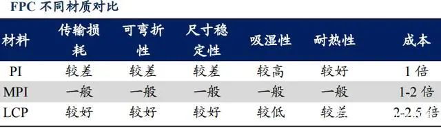 FPC材質(zhì)的替換將不可阻擋,MPI有望崛起,而LCP更適應(yīng)高端產(chǎn)品。MPI易加工生產(chǎn),各項性能適中。