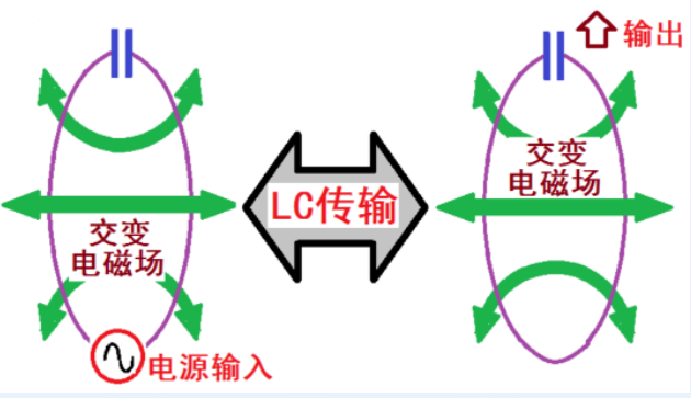 圖中的能量以磁場(chǎng)形式進(jìn)行無(wú)線傳輸,相當(dāng)于一個(gè)隔離變壓器實(shí)現(xiàn)了無(wú)線充電,形成電源發(fā)送端和能量接收端。