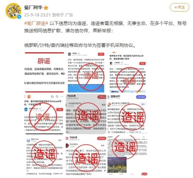 華為表示,造謠者毫無根據,無事生非,在多個平臺、賬號推送相同信息擴散,請網友勿信勿傳,果斷舉報。