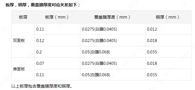 首先看板厚,正常基材PI厚度和銅厚都是固定的,兩者相加就是固定的材料厚度,比如PI基材厚度一般是25um,選1oz銅就是35um,雙面板基材厚度就是35+25+35=95um,注意這僅僅是基材的厚度,成品厚度再加上覆蓋膜的厚度就可以了,覆蓋膜厚度見下表,所以標示成品厚度為0.13,0.15mm的板厚基本上都是有膠基材了。